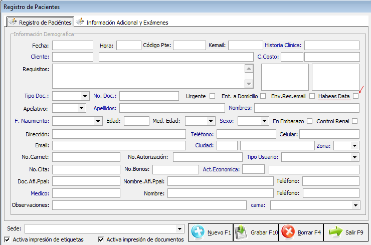 Opción en winsislab en el registro de pacientes, para el ingreso de la autorización de tratamiento de datos personales.